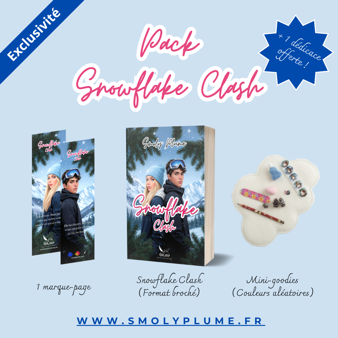 Découvrez en exclusivité le pack Snowflake Clash, conçu par Smoly Plume. Contient : 1 livre Snowflake Clash au format broché + 1 marque-page + mini-goodies (couleurs aléatoires) + 1 dédicace (offerte)
